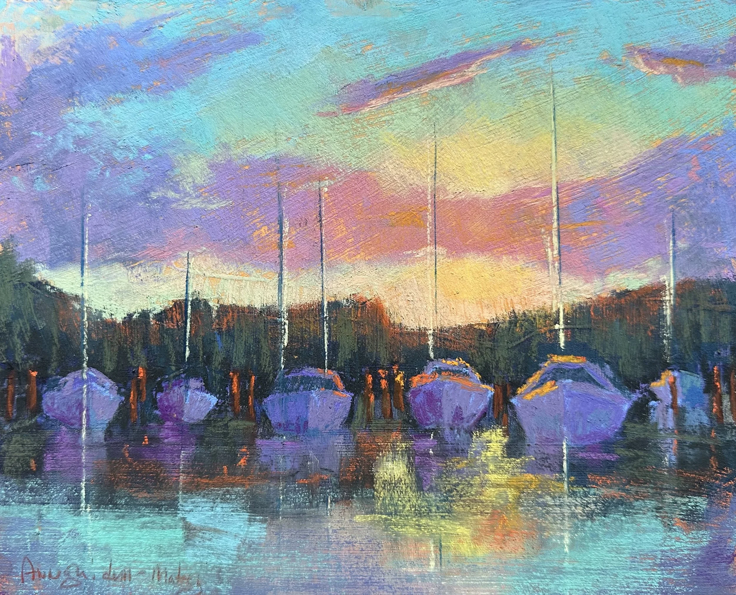 The boats nestled in Swan Creek Harbor gently rocked as they caught the last light of the setting sun.
