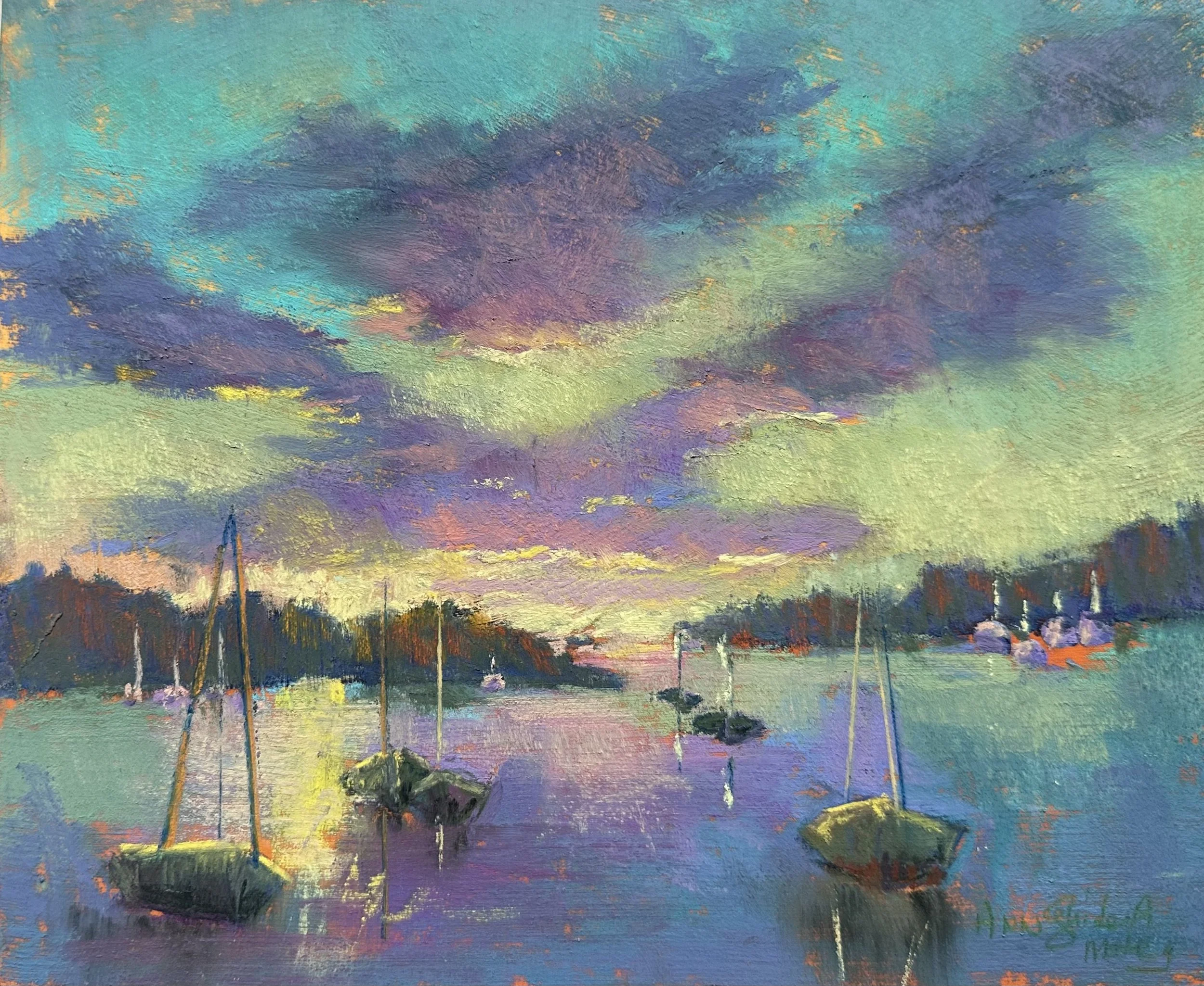 Some sunsets are majestic, and this one over Camden Harbor humbled me. Golden light streamed from behind the clouds, reflected in the rippling water, and sparkled along the sides of boats. I was overwhelmed yet at peace, as if in the presence of something greater—a beautiful, luminous reminder of a higher power.